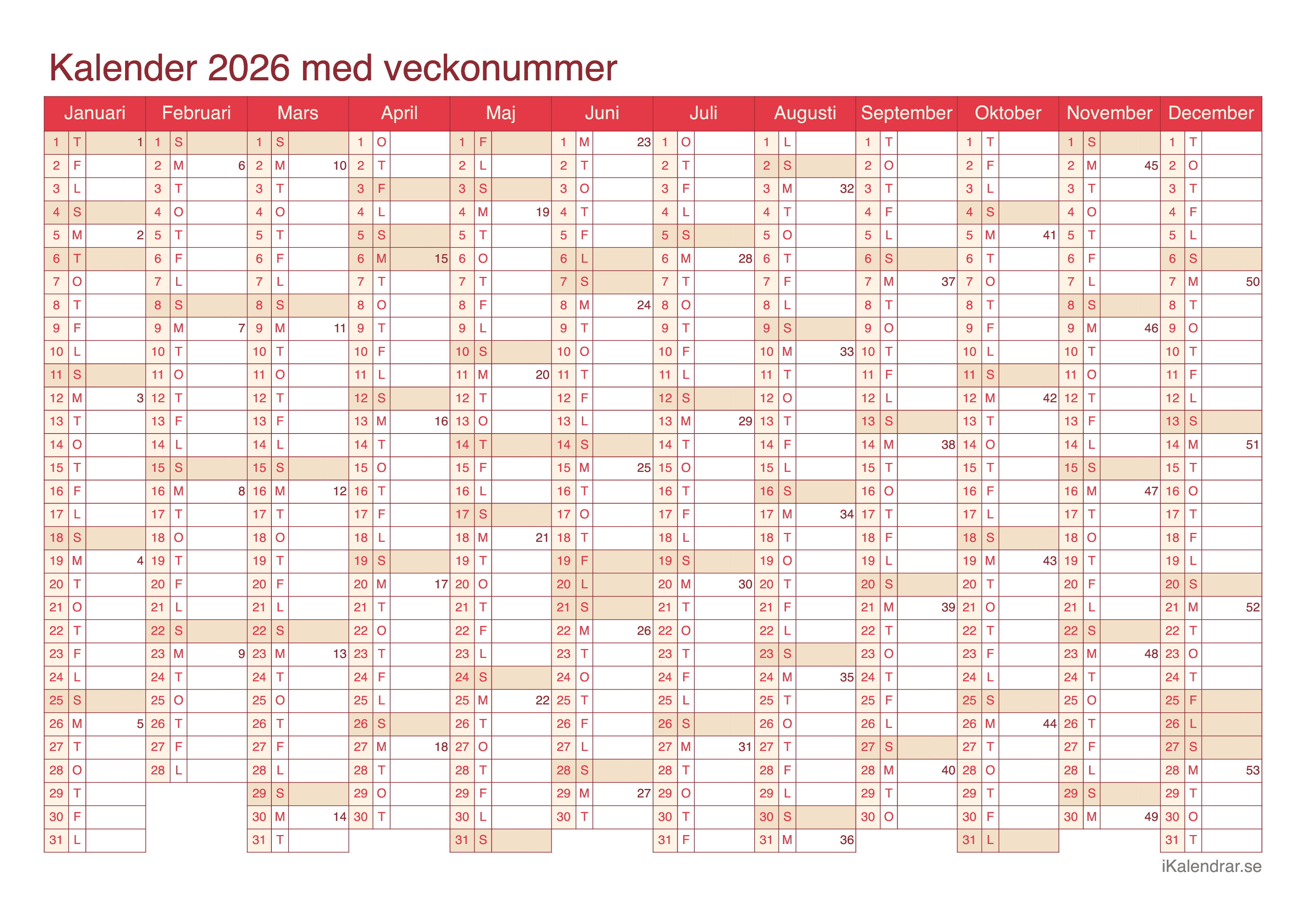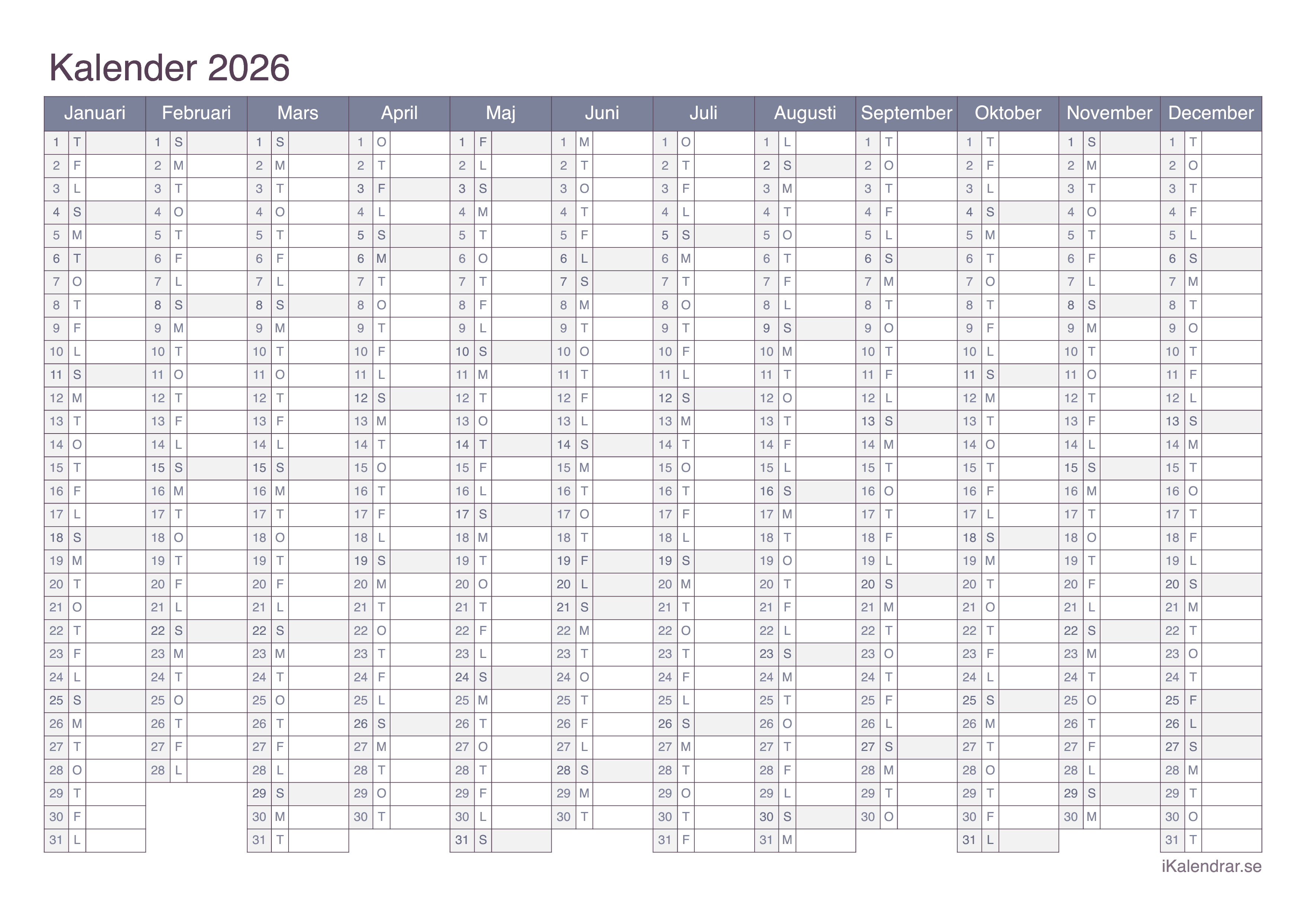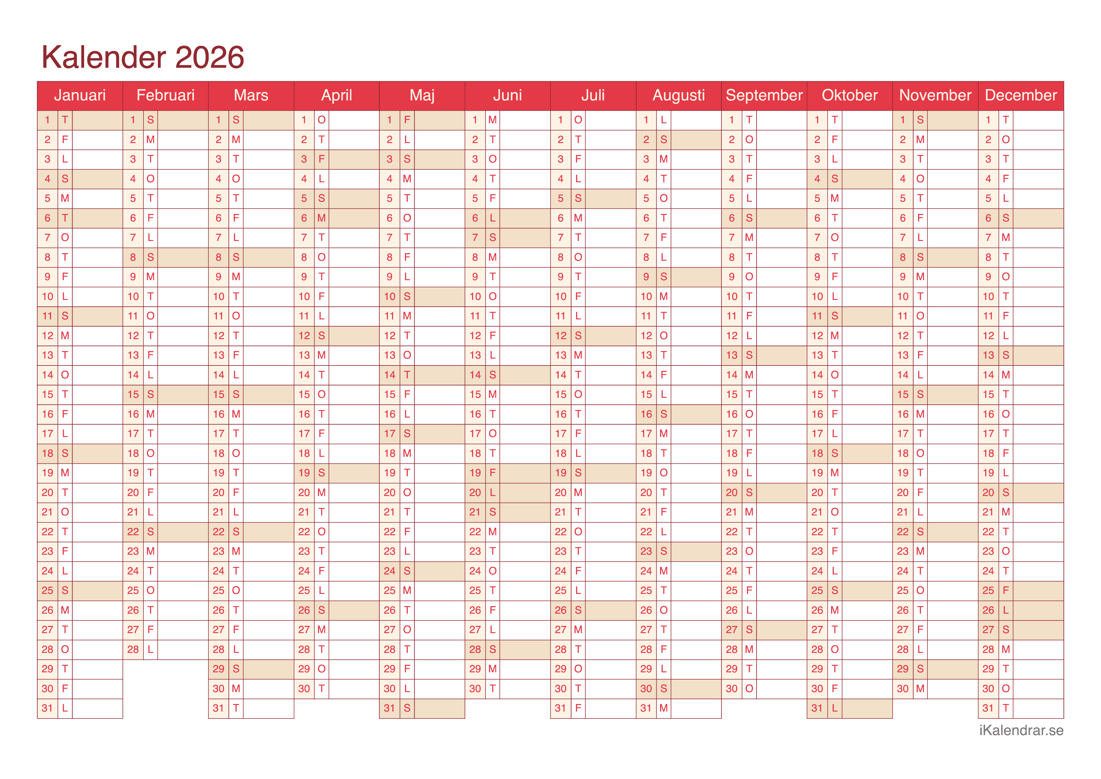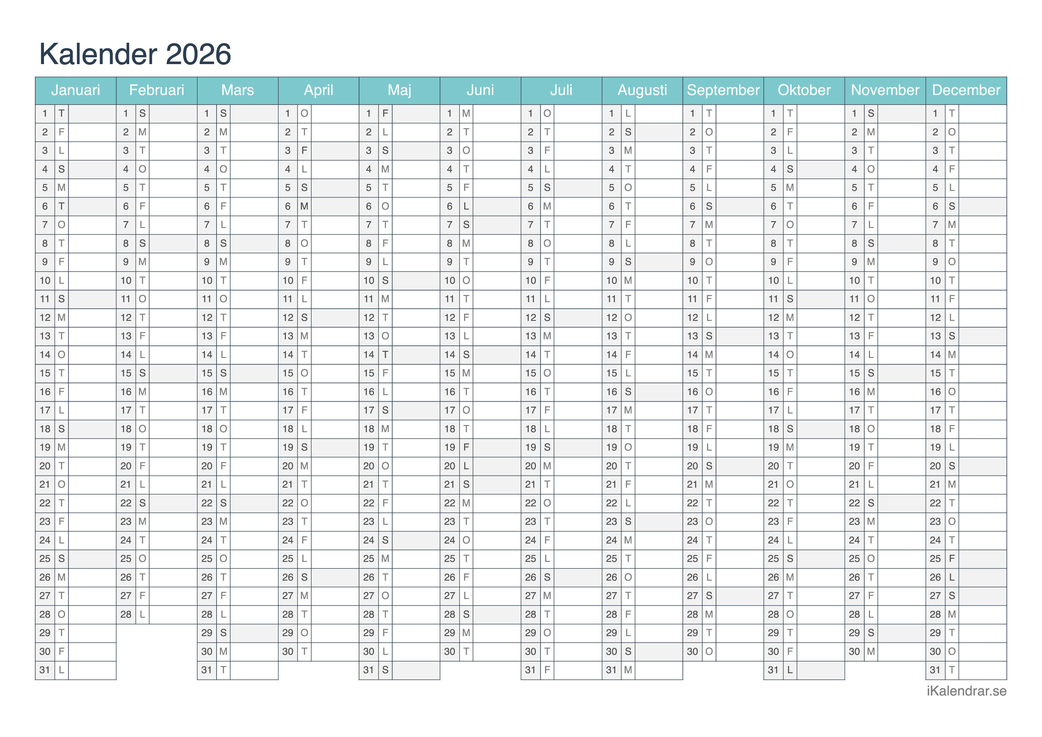 Våra kalendrar är upphovsrättsfria och kan laddas ner och skrivas ut direkt. Följande tabell visar hela året på en sida och finns tillgänglig i bild-, Excel- och PDF-format.