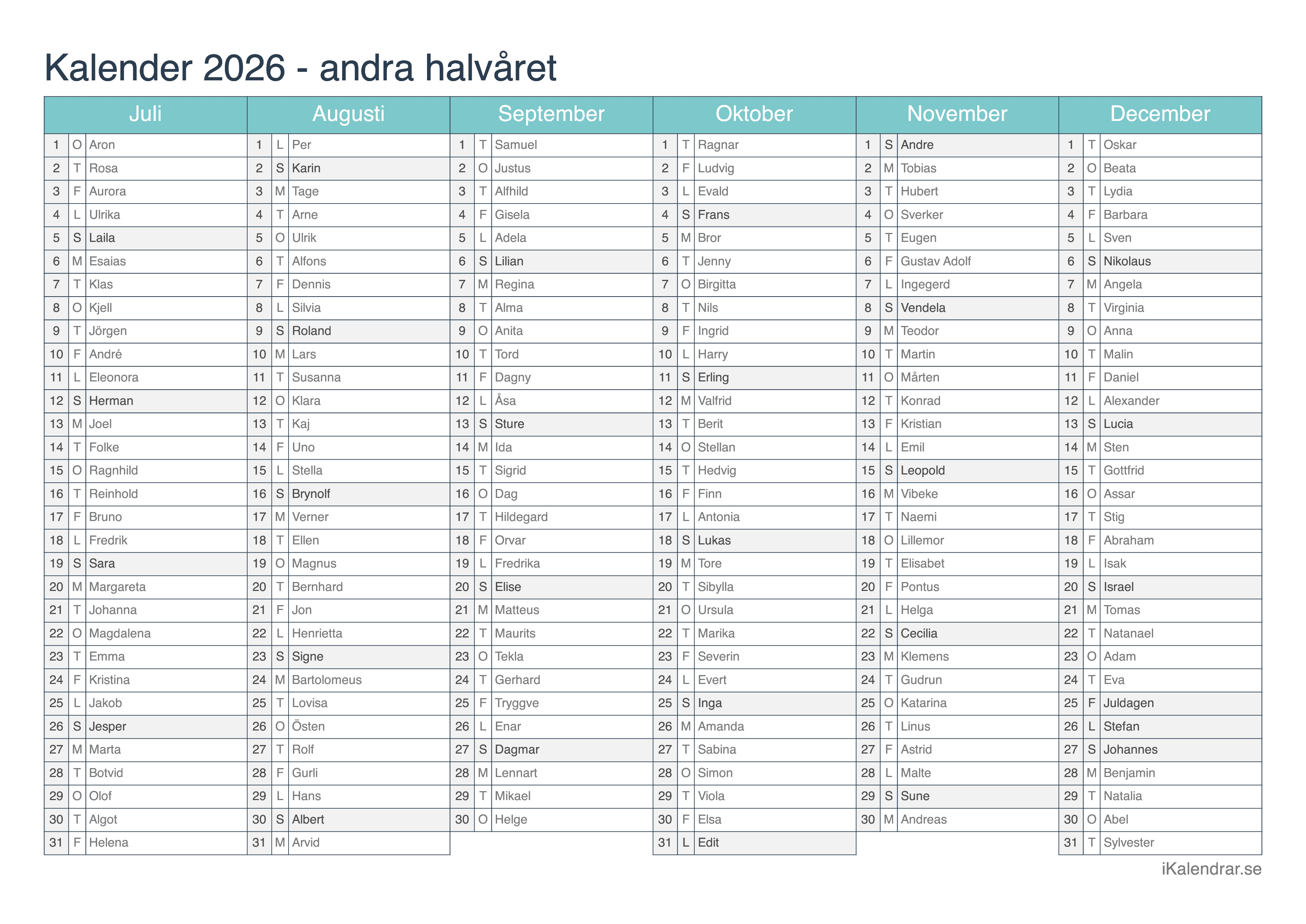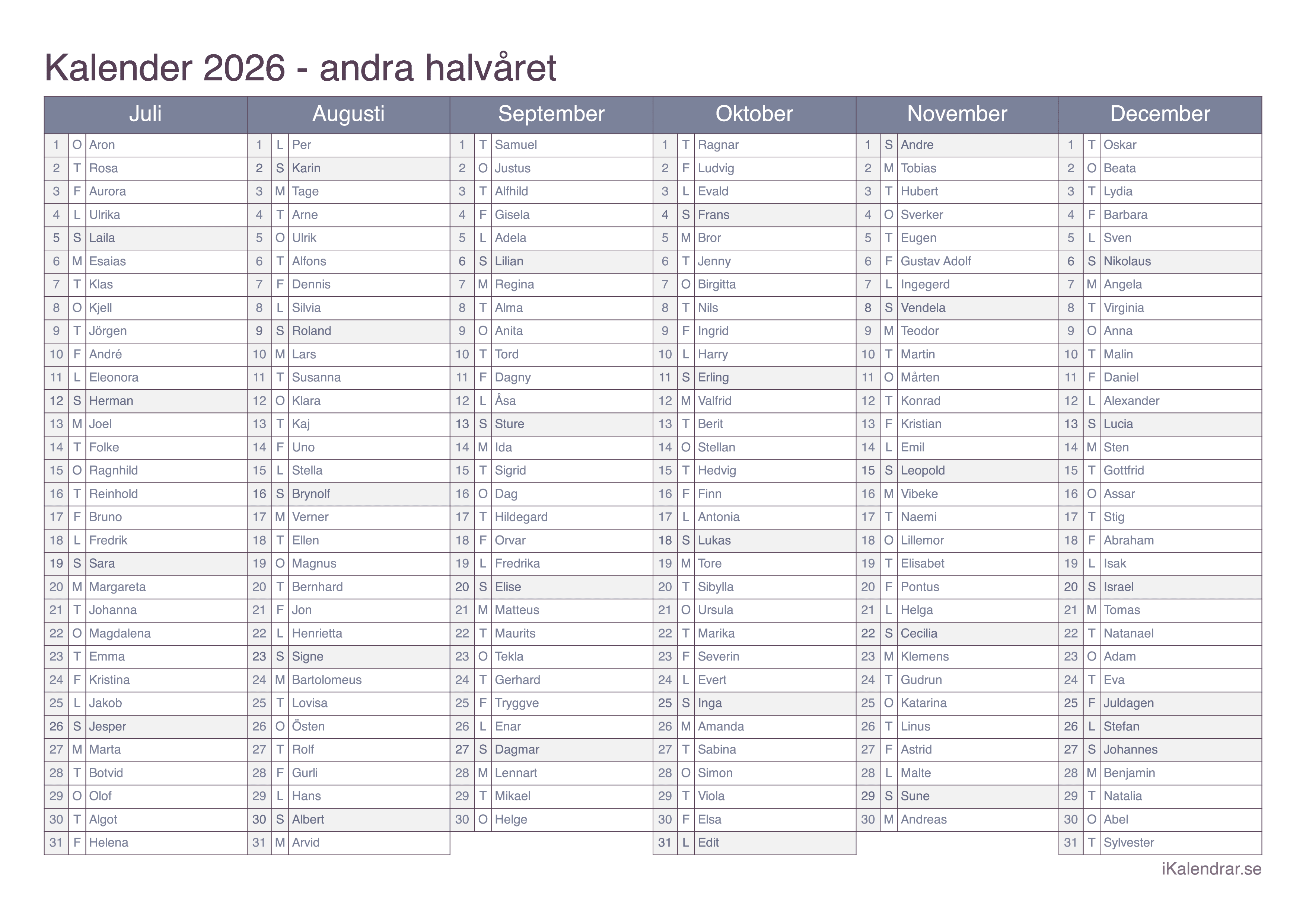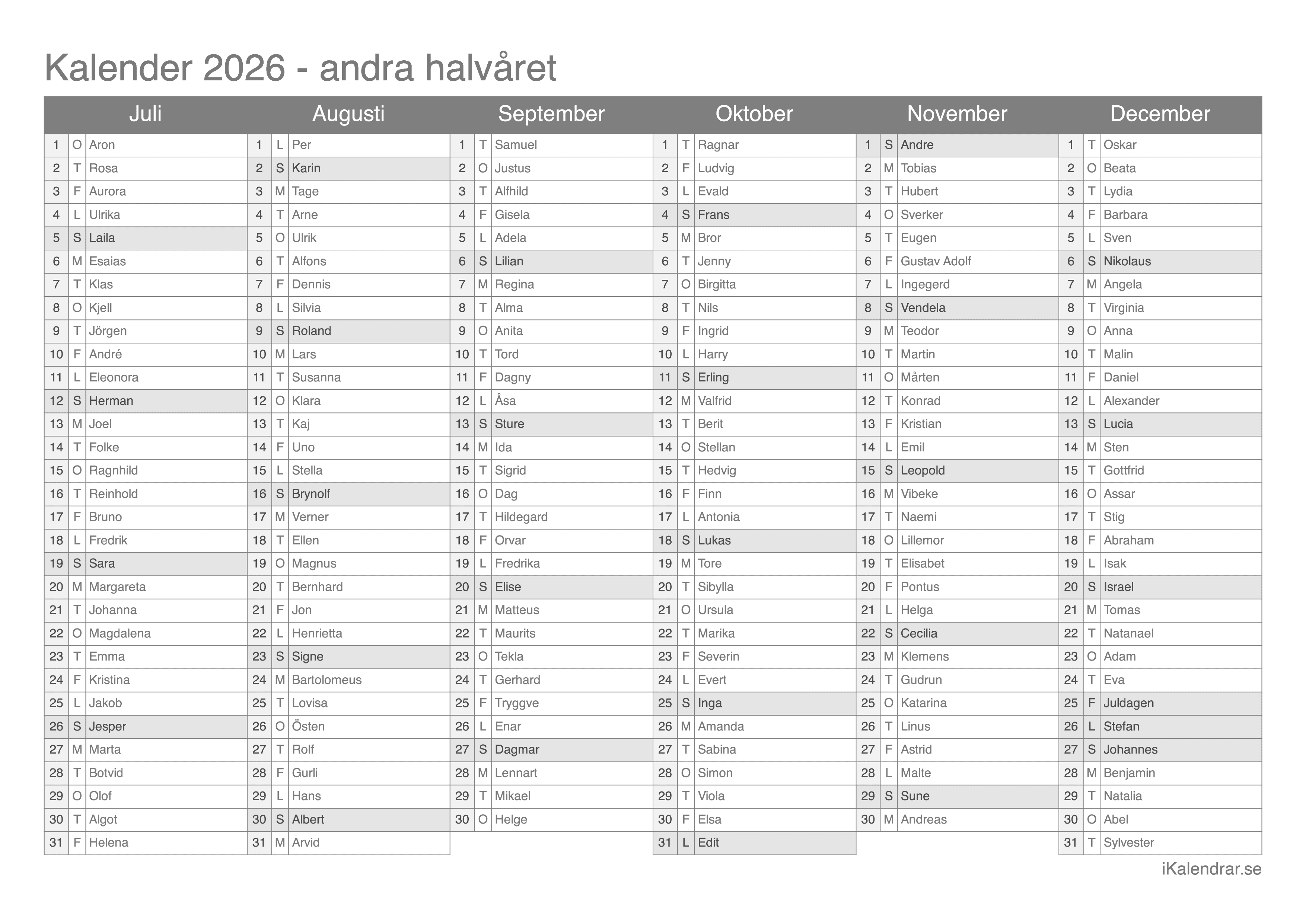 Våra kalendrar är upphovsrättsfria och kan laddas ner och skrivas ut direkt. Följande tabell visar hela året på en sida och finns tillgänglig i bild-, Excel- och PDF-format.