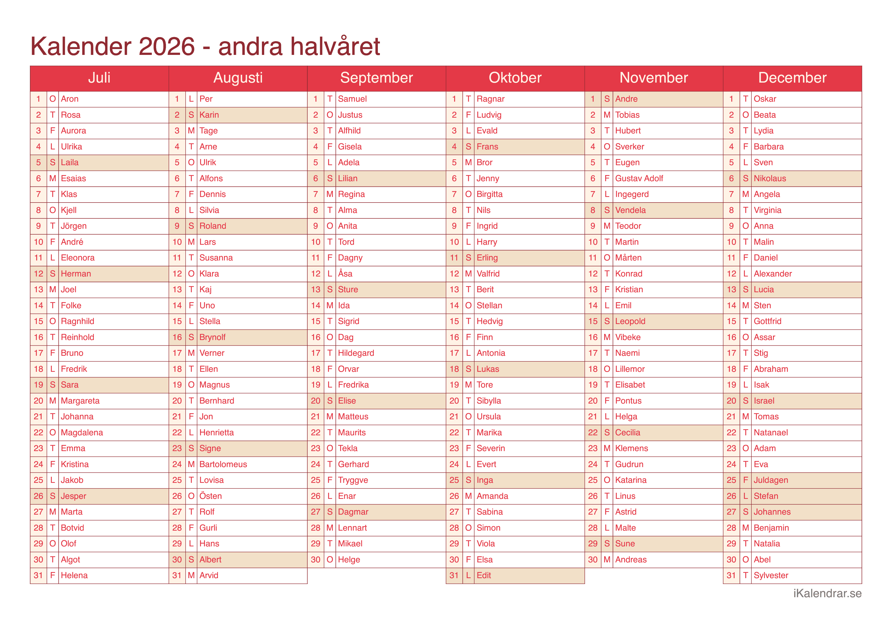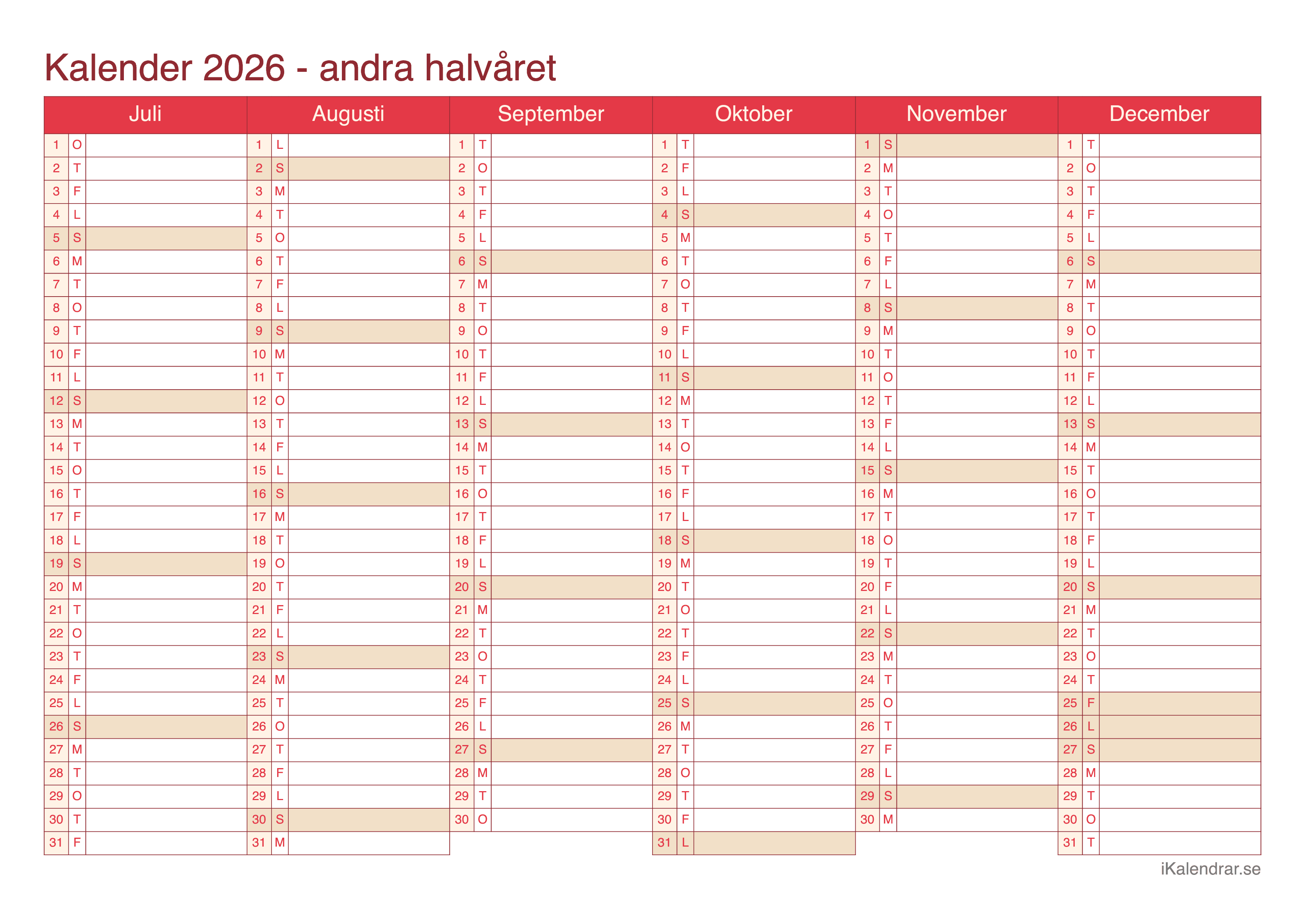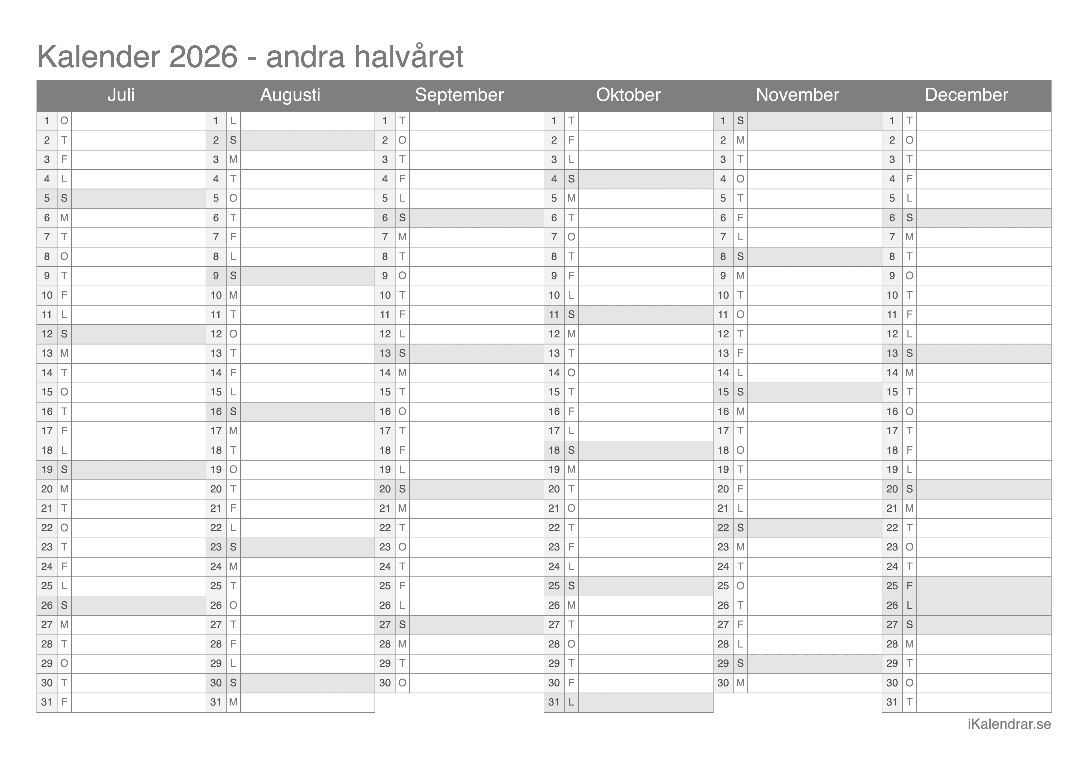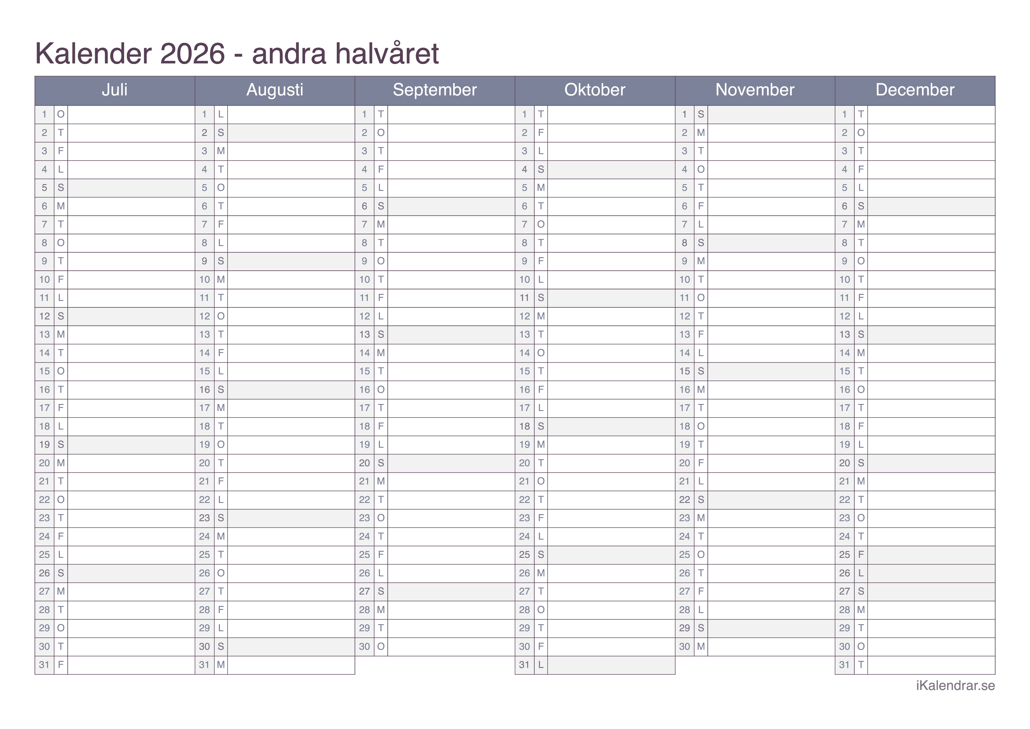 Våra kalendrar är upphovsrättsfria och kan laddas ner och skrivas ut direkt. Följande tabell visar hela året på en sida och finns tillgänglig i bild-, Excel- och PDF-format.