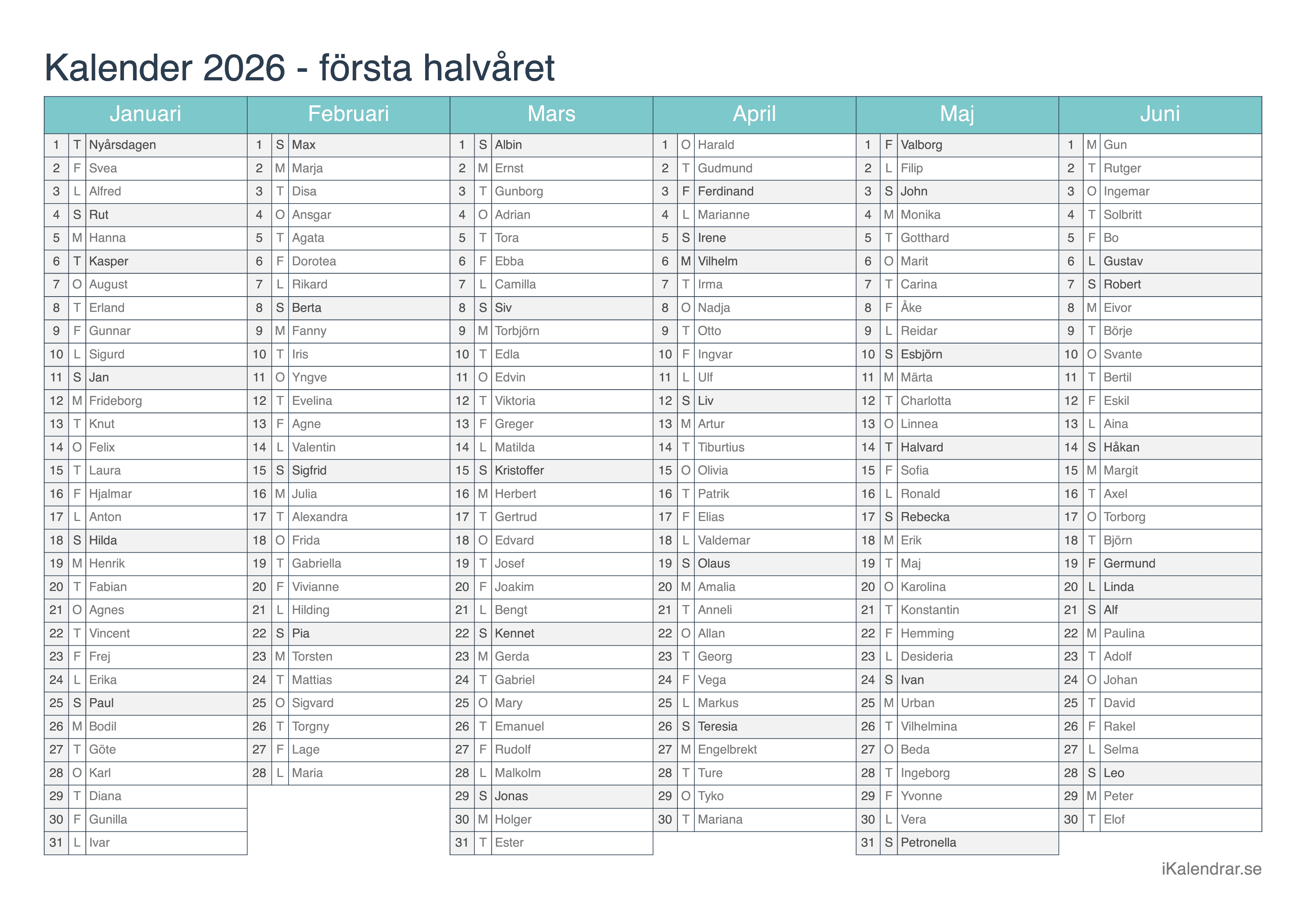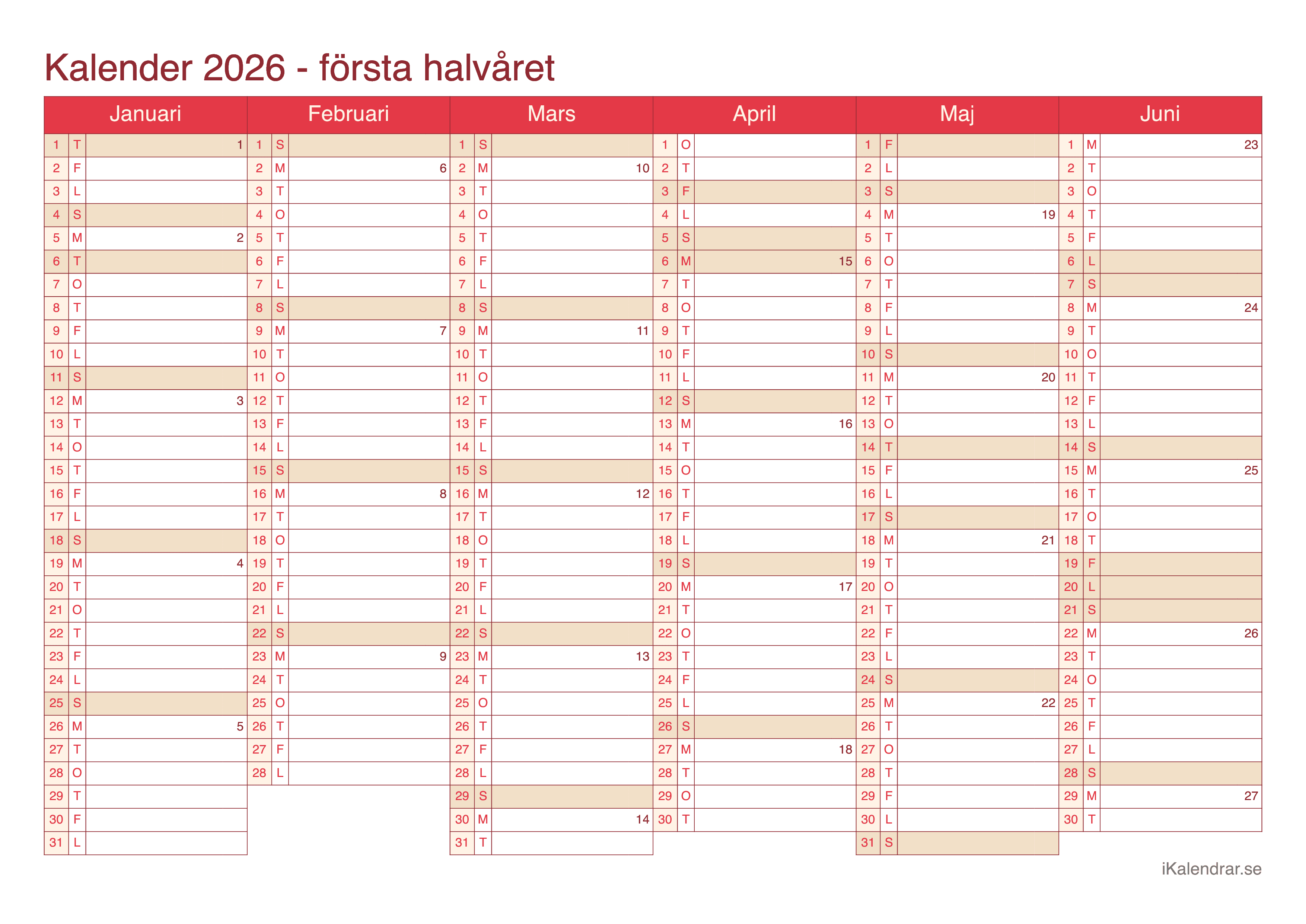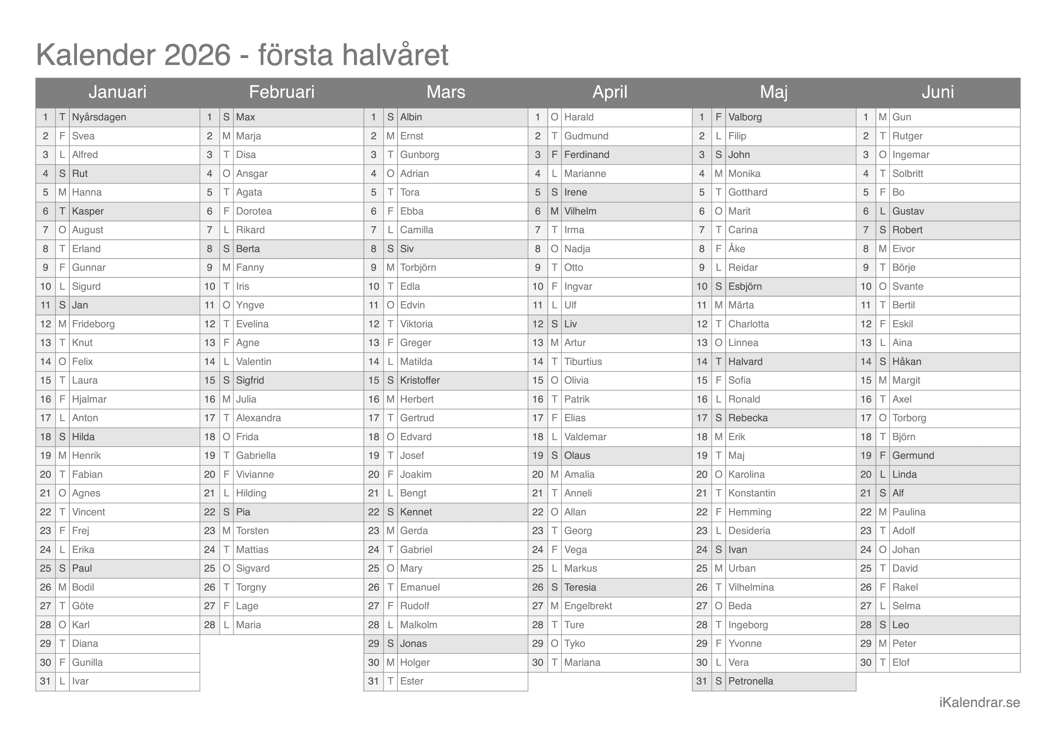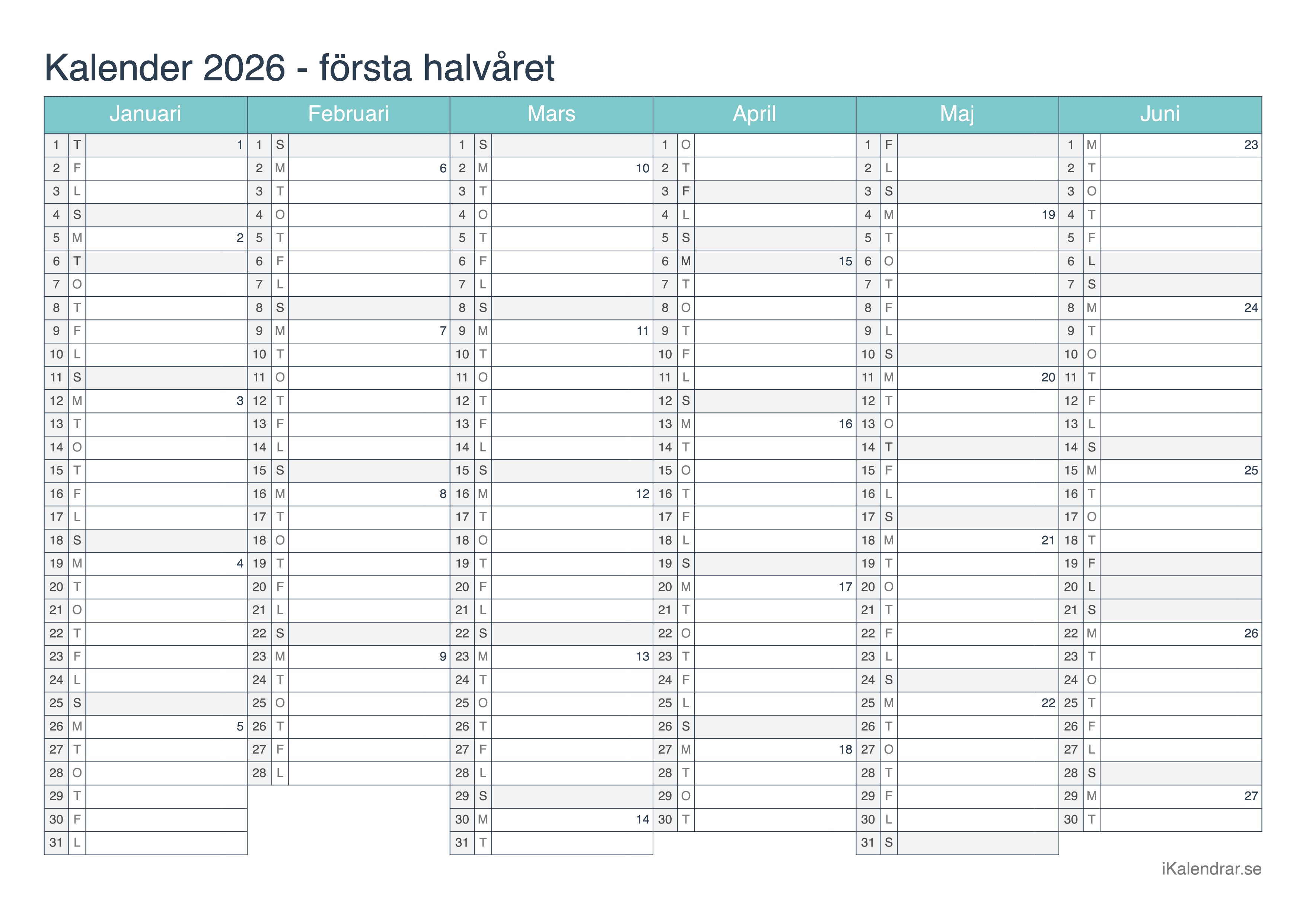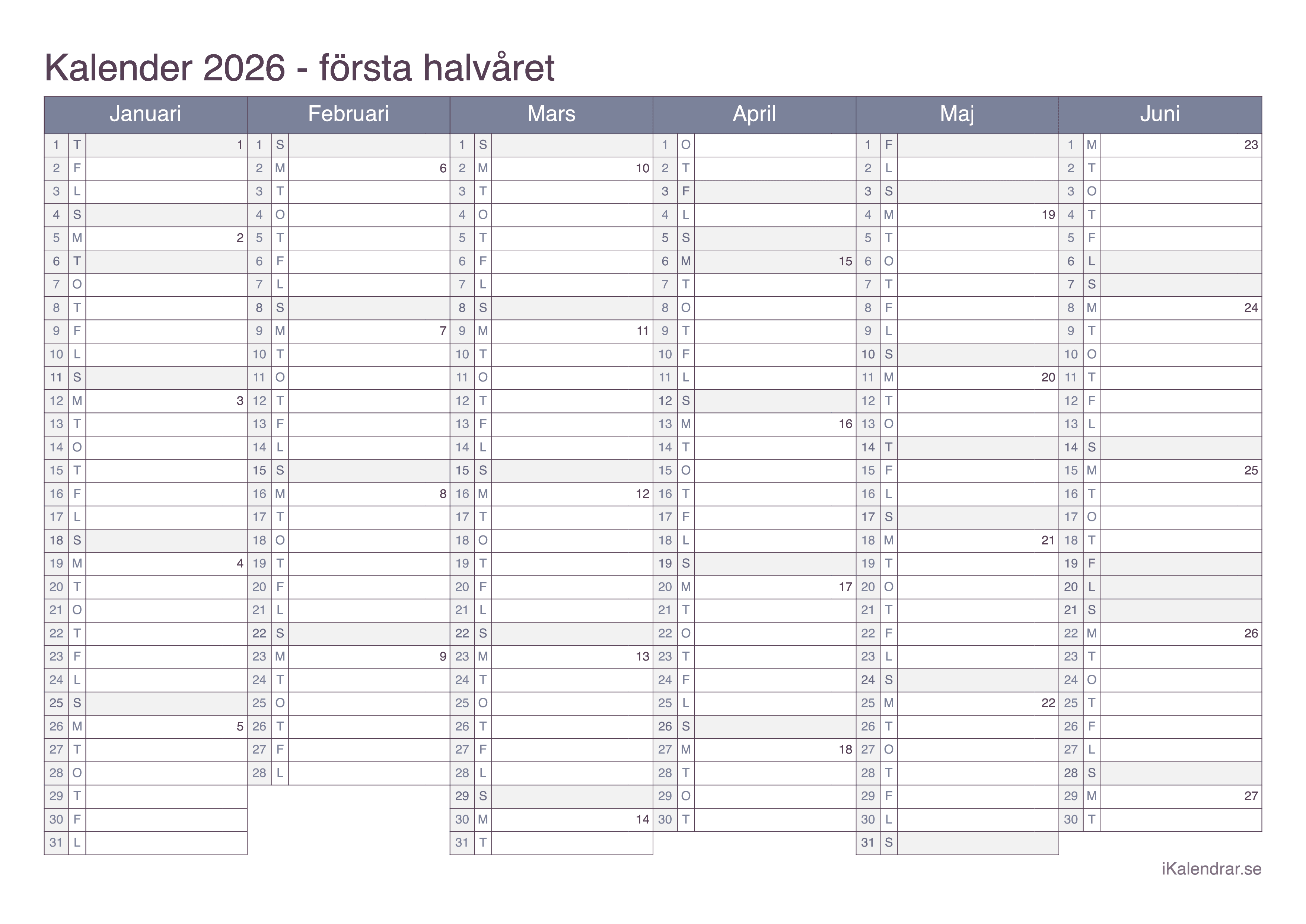 Vi erbjuder dessa utskrivbara halvårskalendrar, en tom och en med antalet veckor, och en med allmänna helgdagar och dagens helgon angivna.