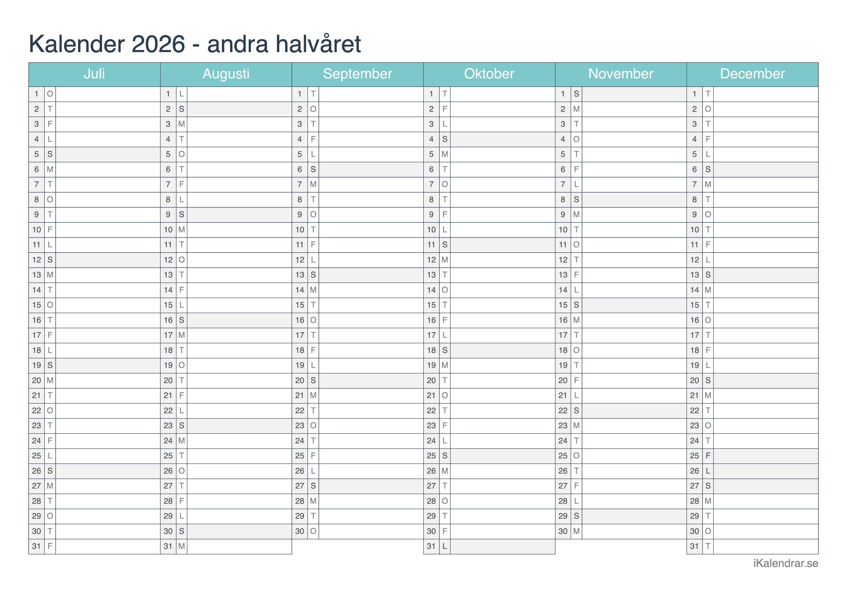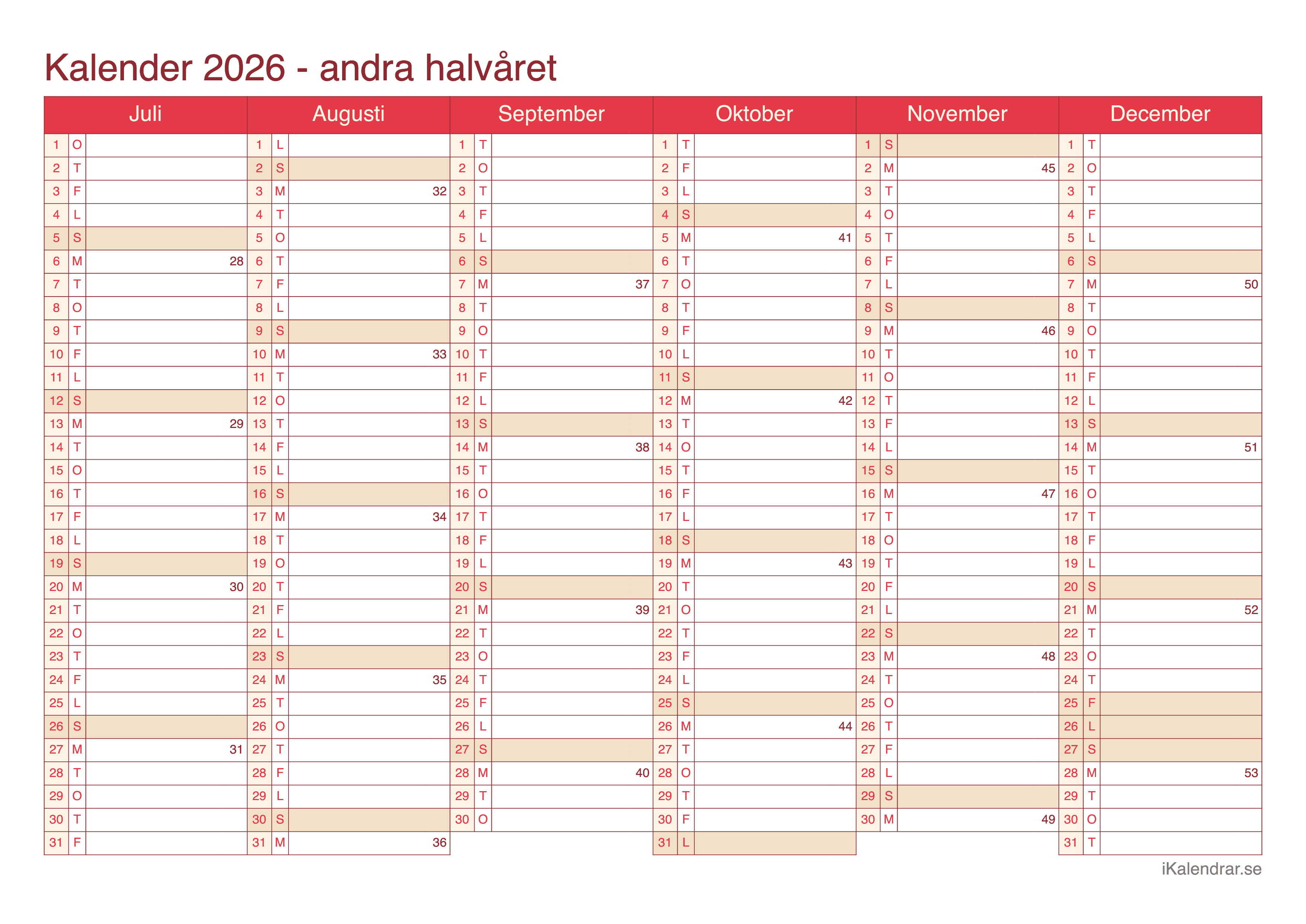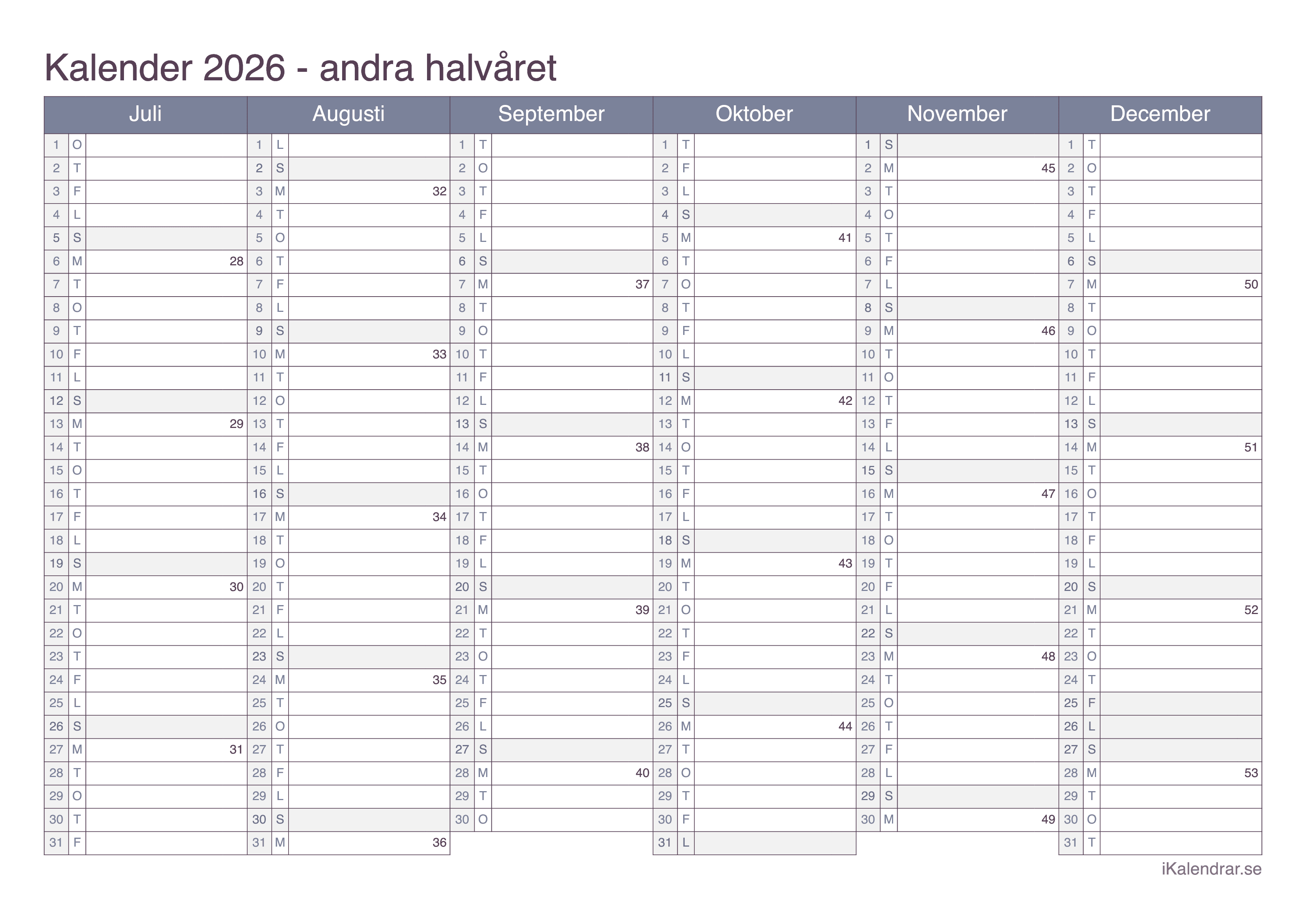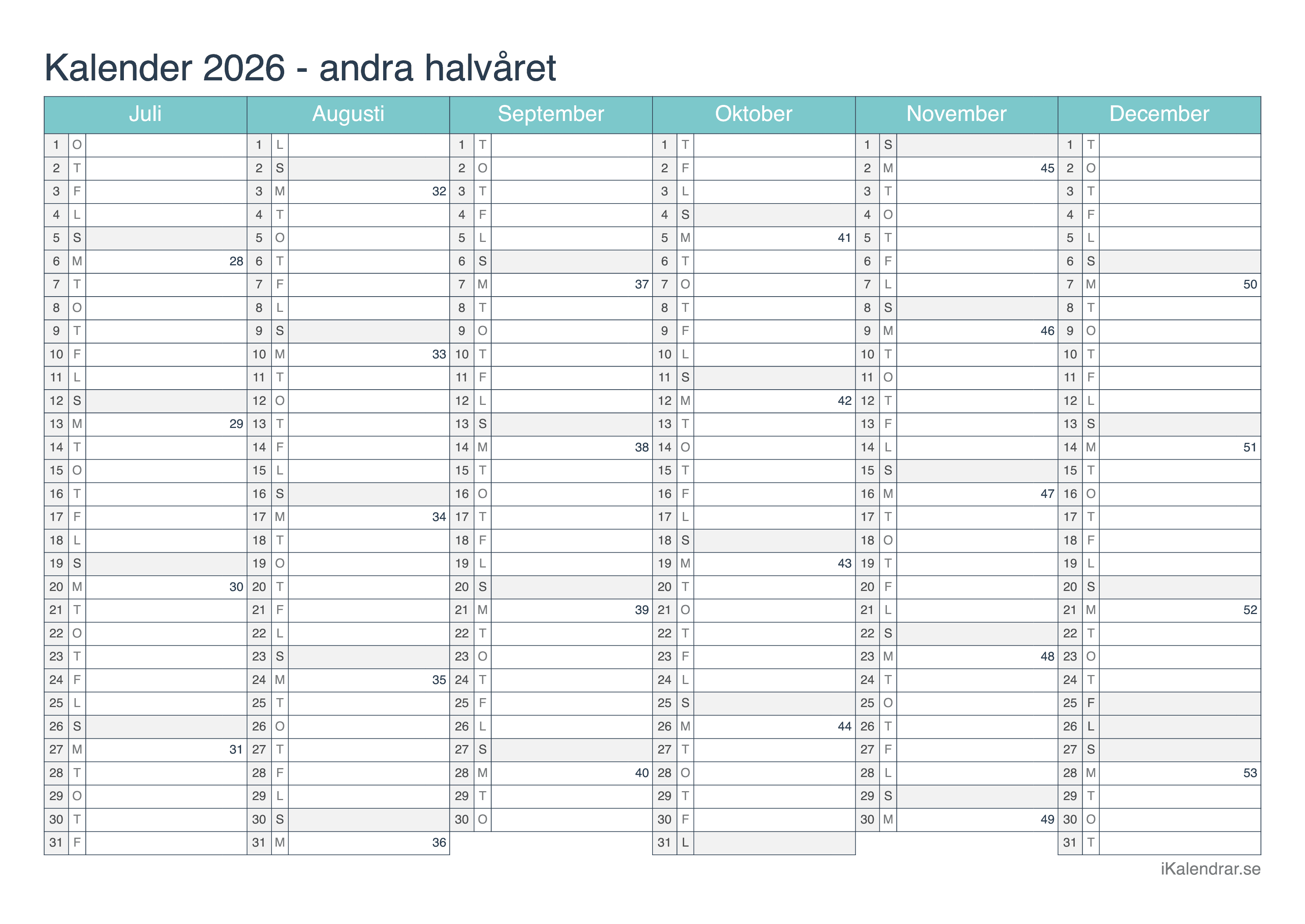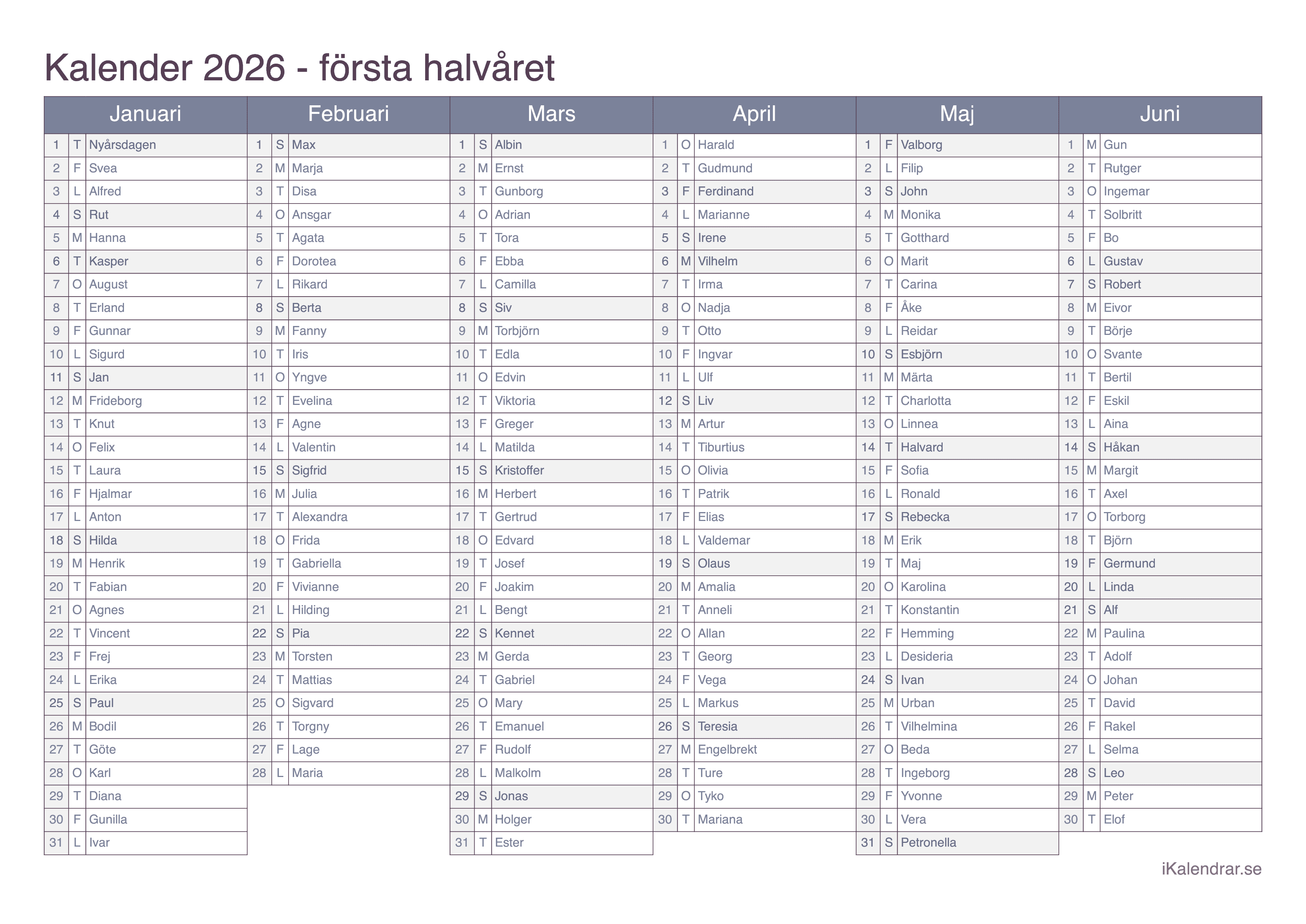 Vi erbjuder dessa utskrivbara halvårskalendrar, en tom och en med antalet veckor, och en med allmänna helgdagar och dagens helgon angivna.