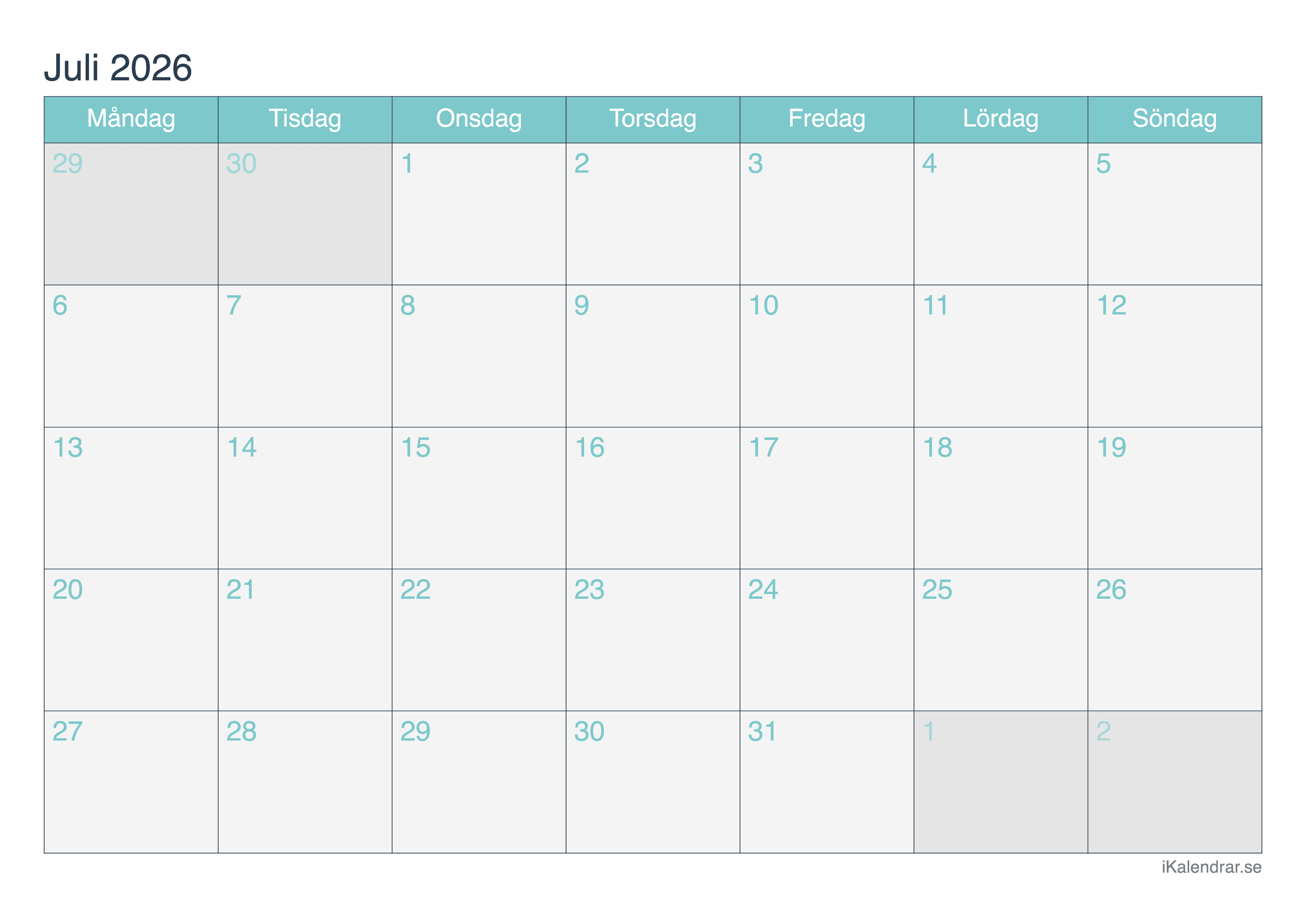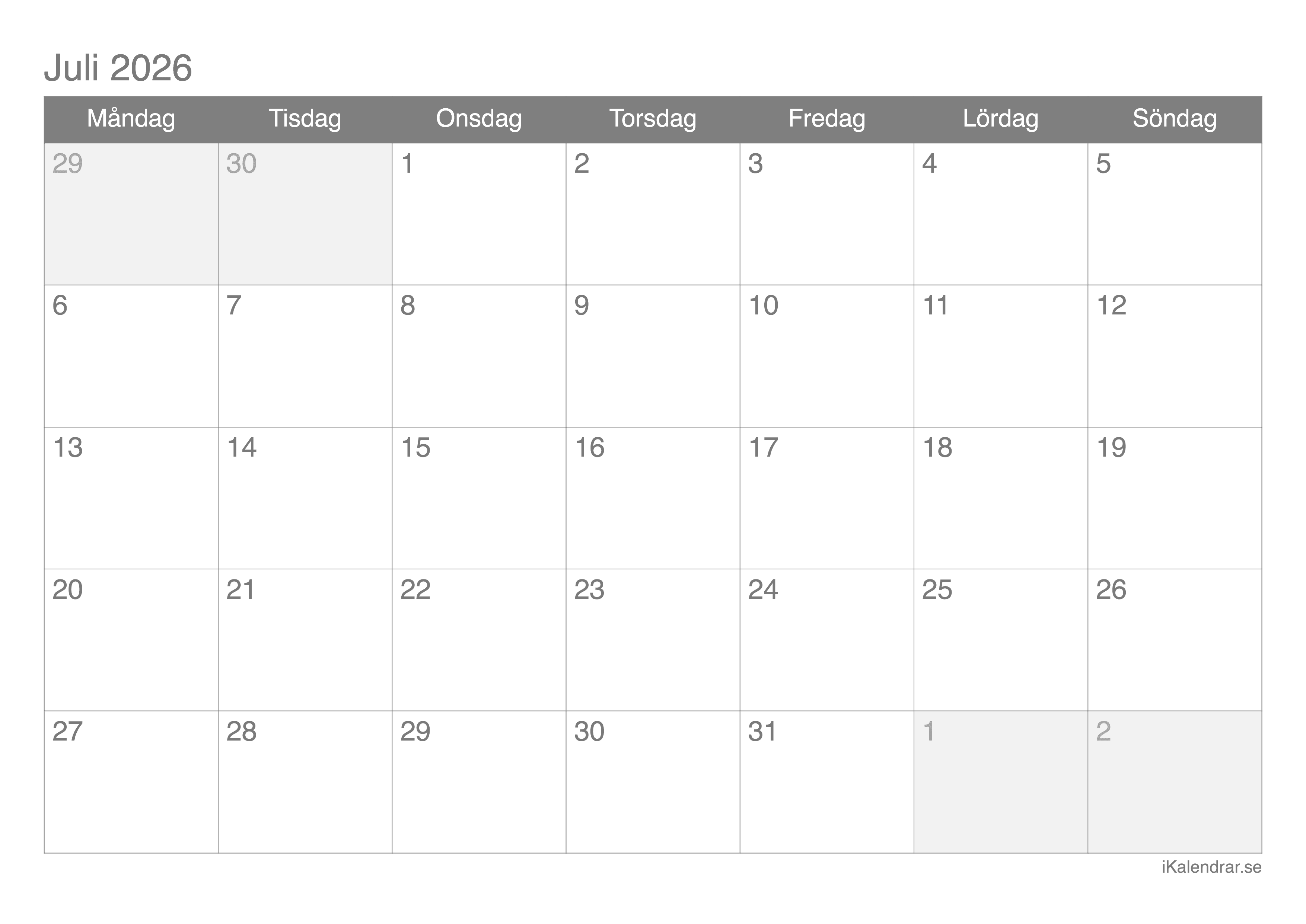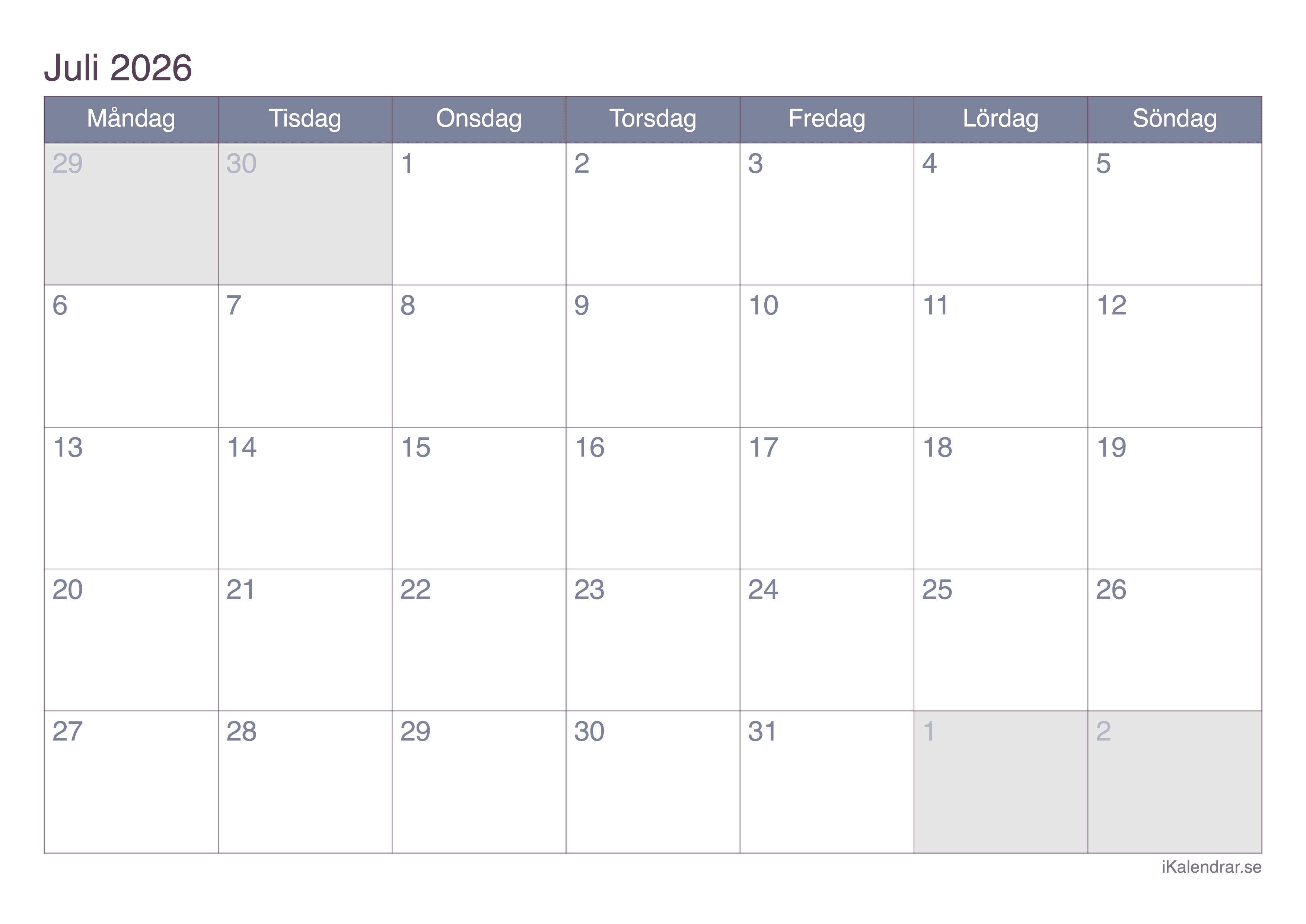 Du kan fritt ladda ner och skriva ut den tomma 2026 juli-kalendern i bild-, PDF- och Excel-format. Du kan också hitta andra 2026 kalenderteman för juli.