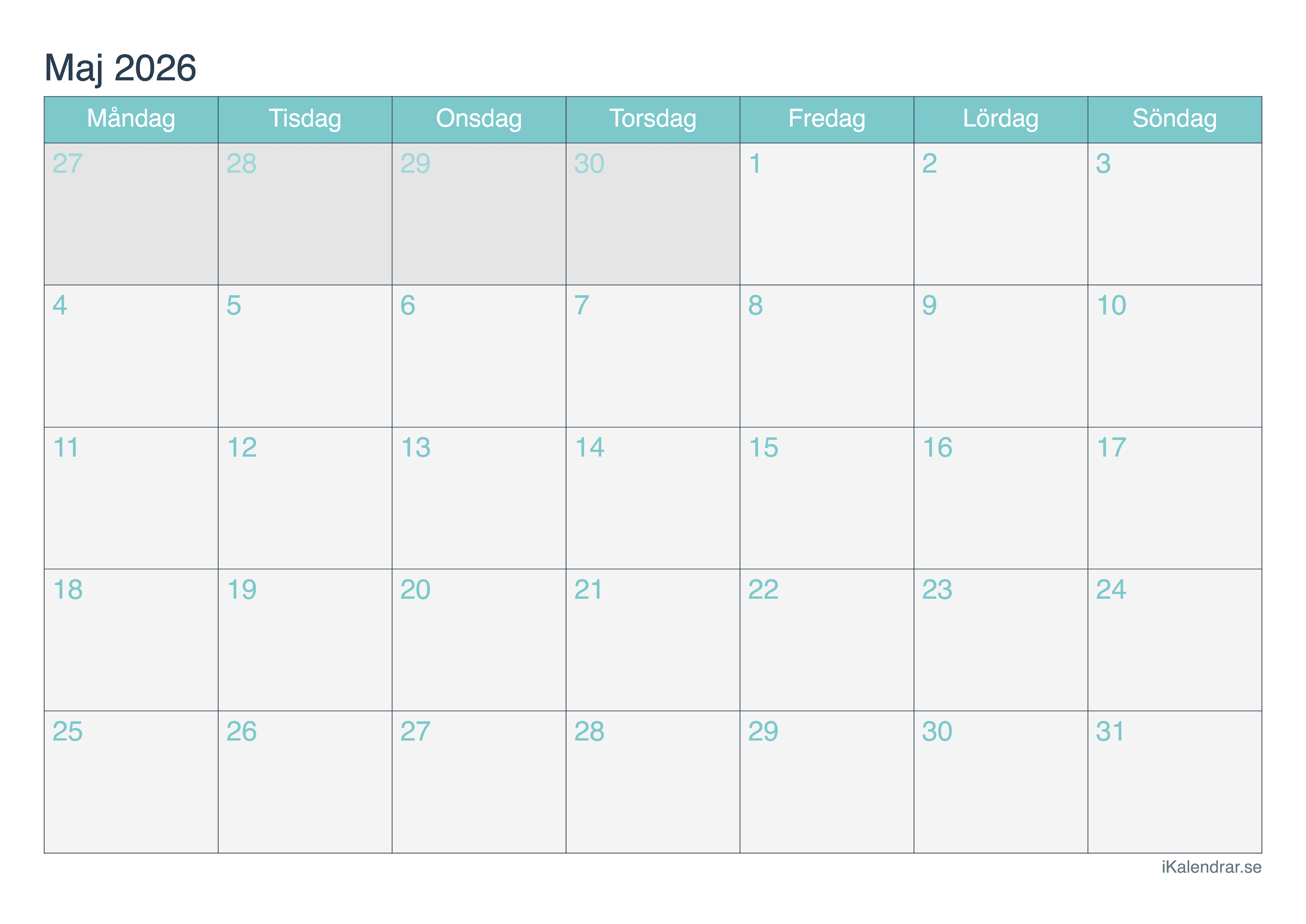 Maj kalender 2026 utskrivbar