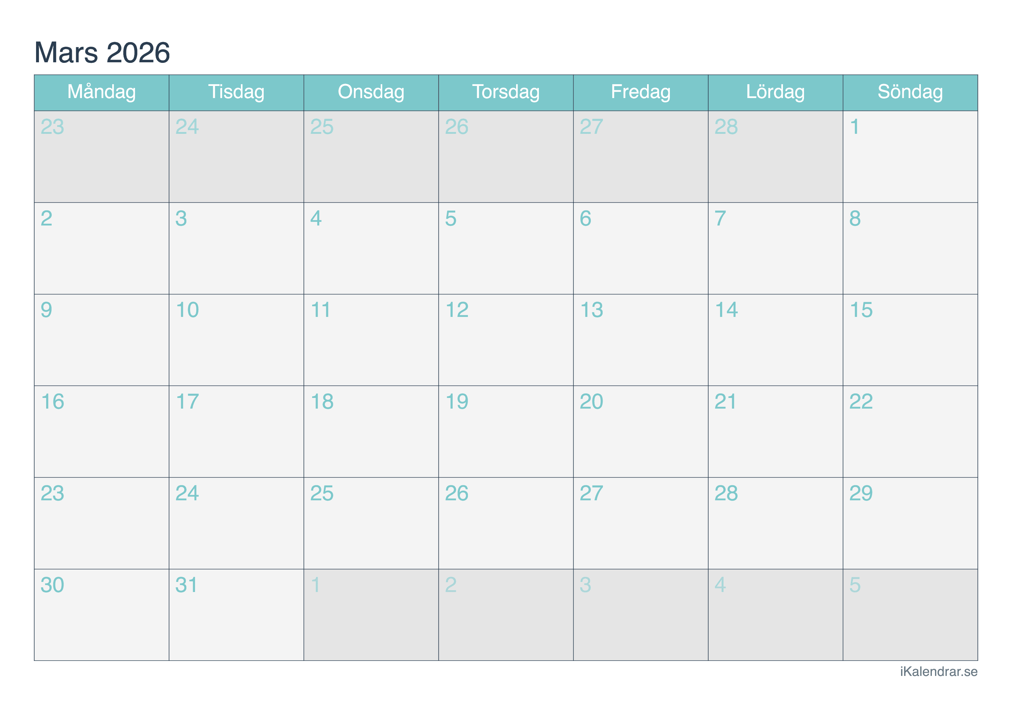 Du kan fritt ladda ner och skriva ut den tomma 2026 marskalender i bild-, PDF- och Excel-format. Du kan också hitta andra 2026 kalenderteman för mars månad.