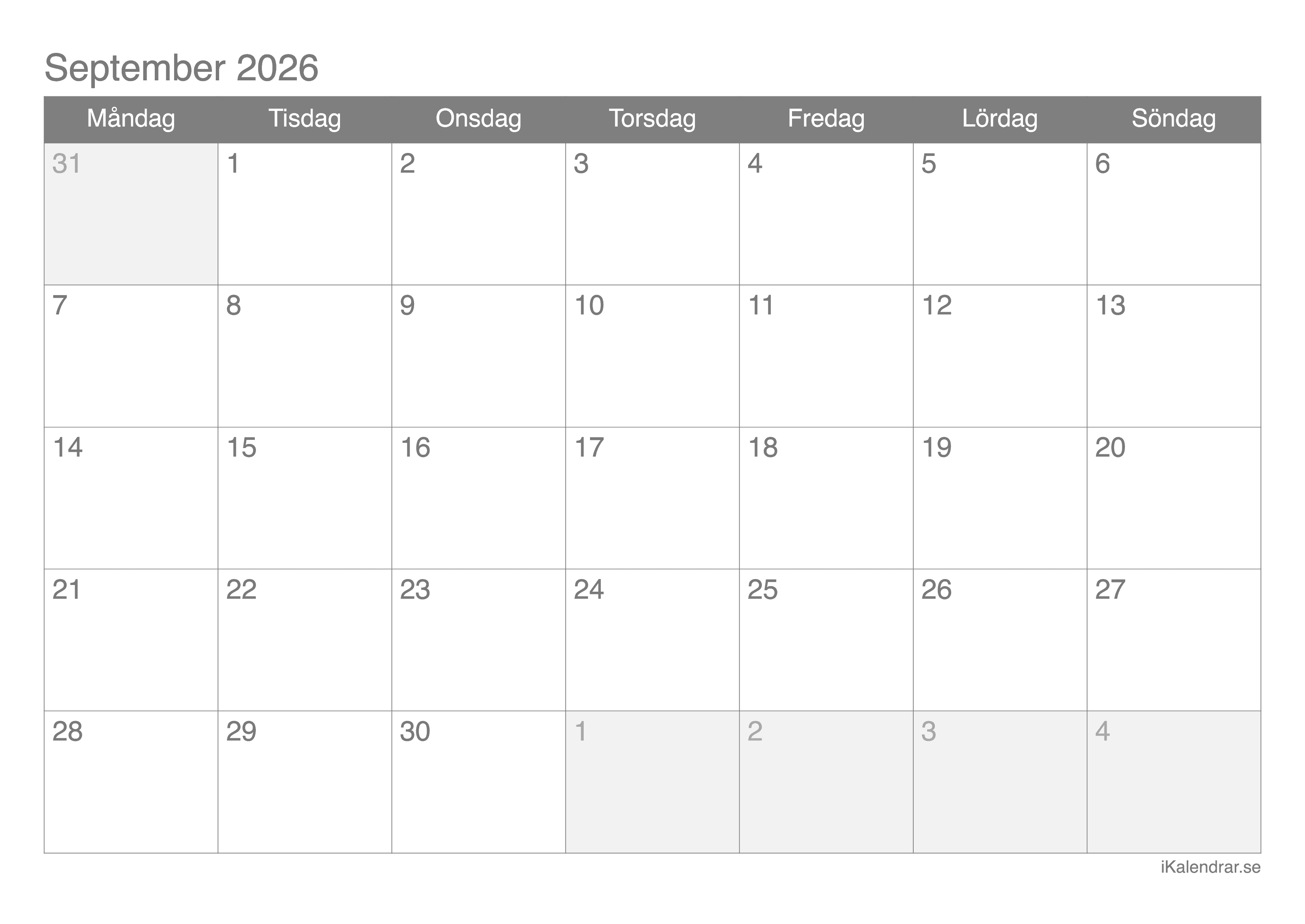 September kalender 2026 utskrivbar